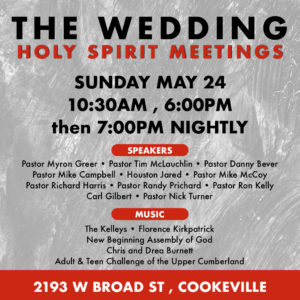 The Wedding, a series of Holy Spirit meetings, will begin on Sunday May 24, with services at 10:30am and 6:00pm. Evening services will follow every night at 7pm with a variety of music and guest speakers. Meetings will be held at New Beginning Assembly of God, at 2193 W Broad St, Cookeville, TN.